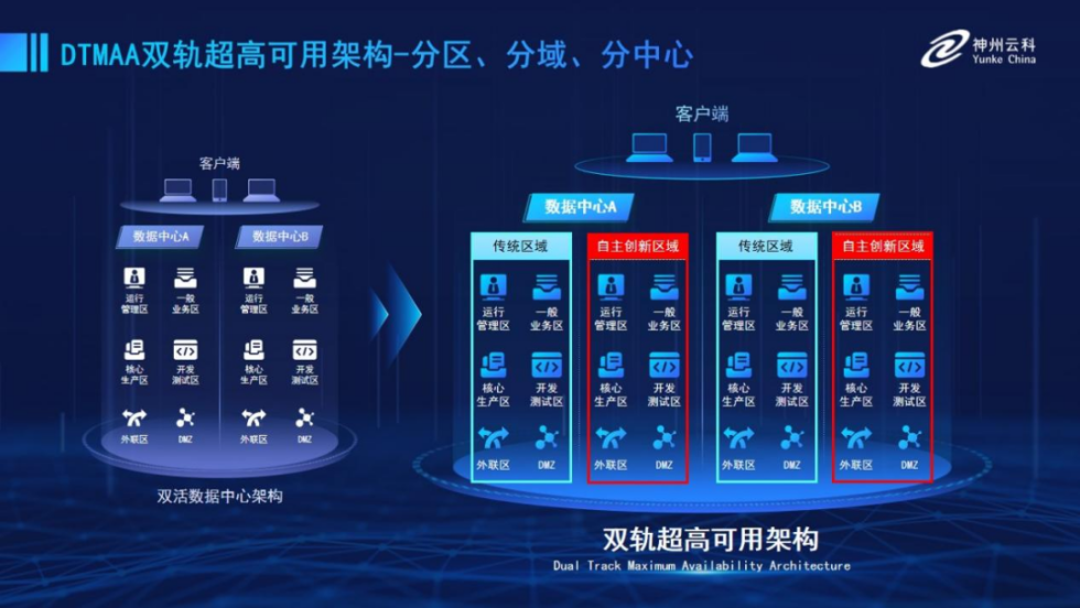 为帮助金融客户更好地应对数字经济时代对可持续性的高要求,实现“信创”与“数字化”齐头并进,NO钱包官网推出了双轨超高可用架构。该架构在双活数据中心的分区调度基础上,增加信创域和非信创域的分域调度,实行信创域与传统域应用全量部署,使双中心运营变为双中心四区域并行运行,互为多活,将“0到1”的单轨建设道路变为分区分域协同的多活双轨超高可用架构。帮助客户在新架构下,保障“信创”的同时解决性能瓶颈,提升稳定性,保证应用可持续性,最终实现信创区域和非信创区域的平滑过渡,完成国产化替代目标。